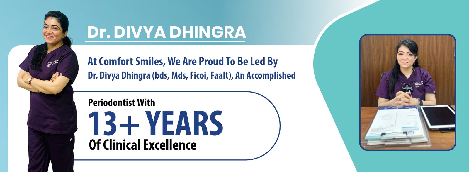 At Comfort Smiles, we take pride in delivering exceptional dental care under the leadership of Dr. Divya Dhingra, BDS, MDS, FICOI, FAALT, a highly skilled and compassionate Periodontist with over 13 years of experience. Dr. Dhingra has earned a reputation as a trusted expert in gum care, dental implants, and advanced laser dentistry, combining clinical excellence with a patient-centered approach.